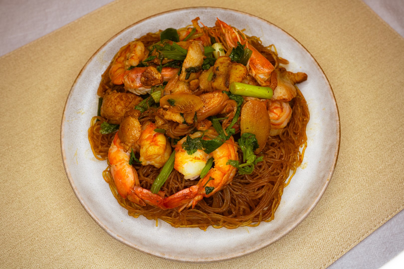 Glass noodles in a homemade sauce with shrimp, pork belly, Thai herbs, green onion and coriander.