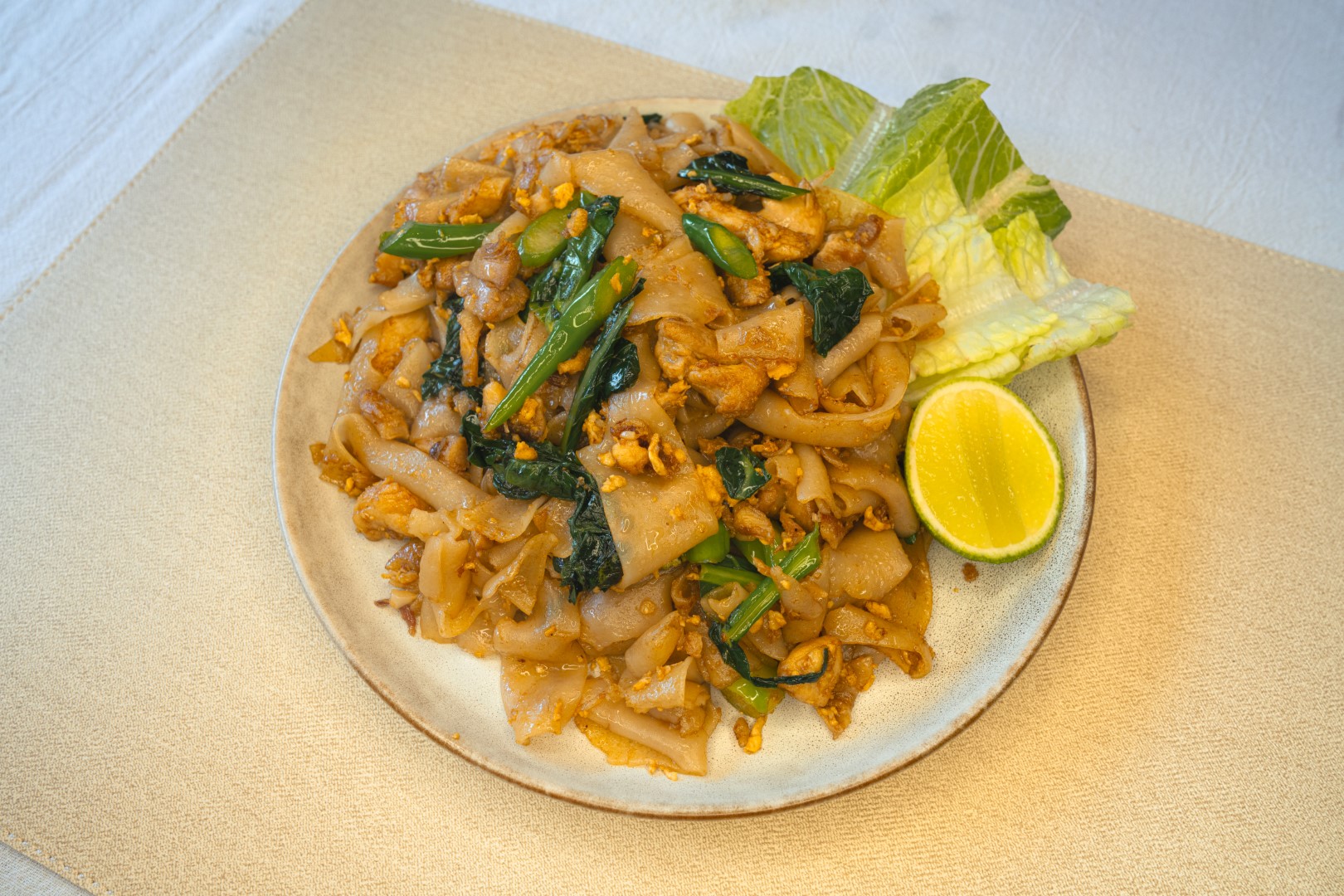 Wide rice noodles fried with Chinese kale, egg, and choice of meat (shrimp/chicken)