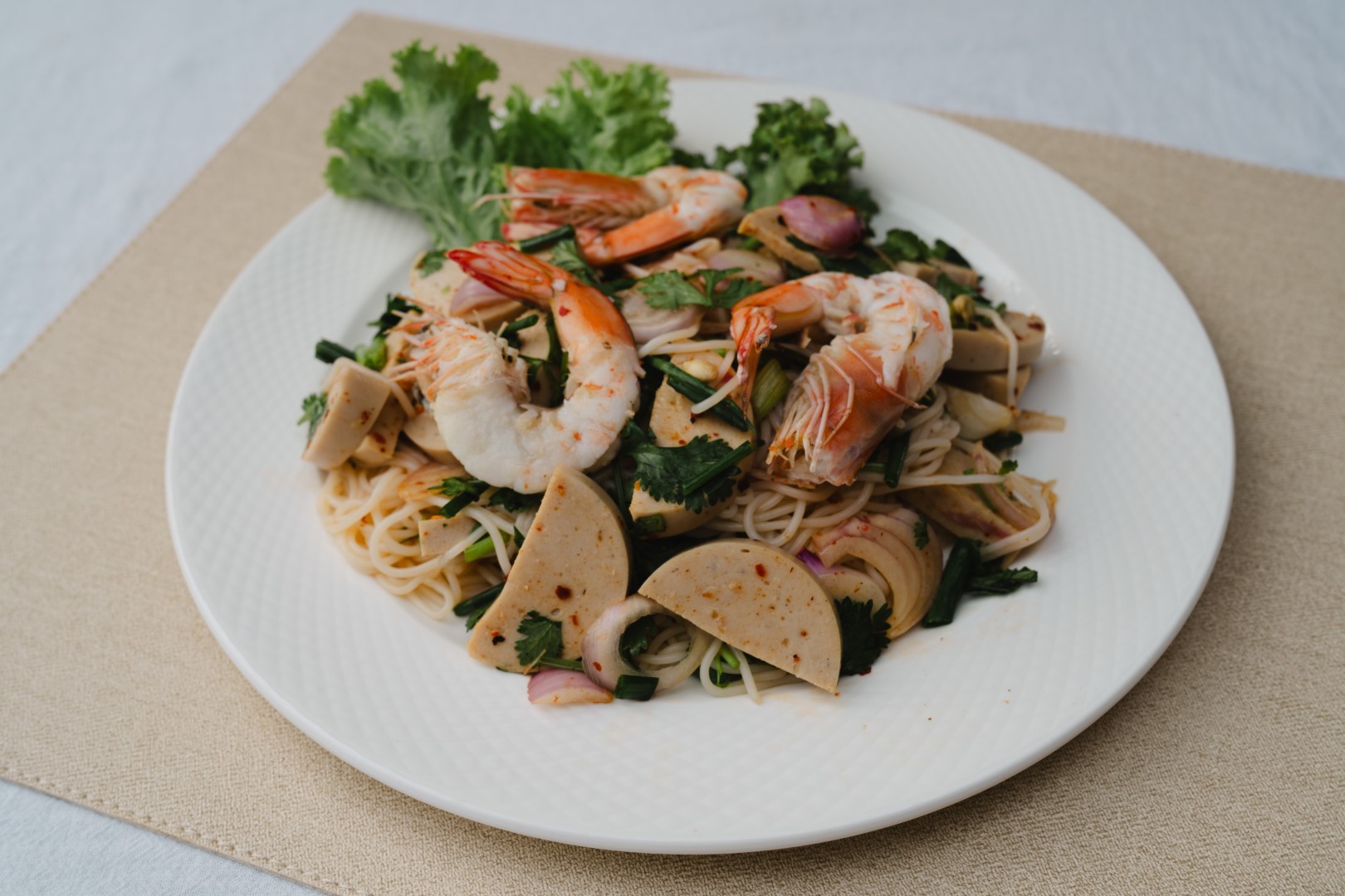 Eclectic mix of rice noodles, boiled shrimp, Thai sausage, minced pork, coriander and onion.