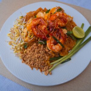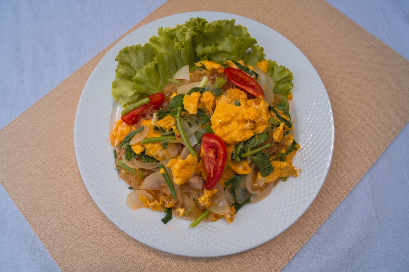 Glass noodles cooked with yellow onion, Chinese celery, egg and tomatoes