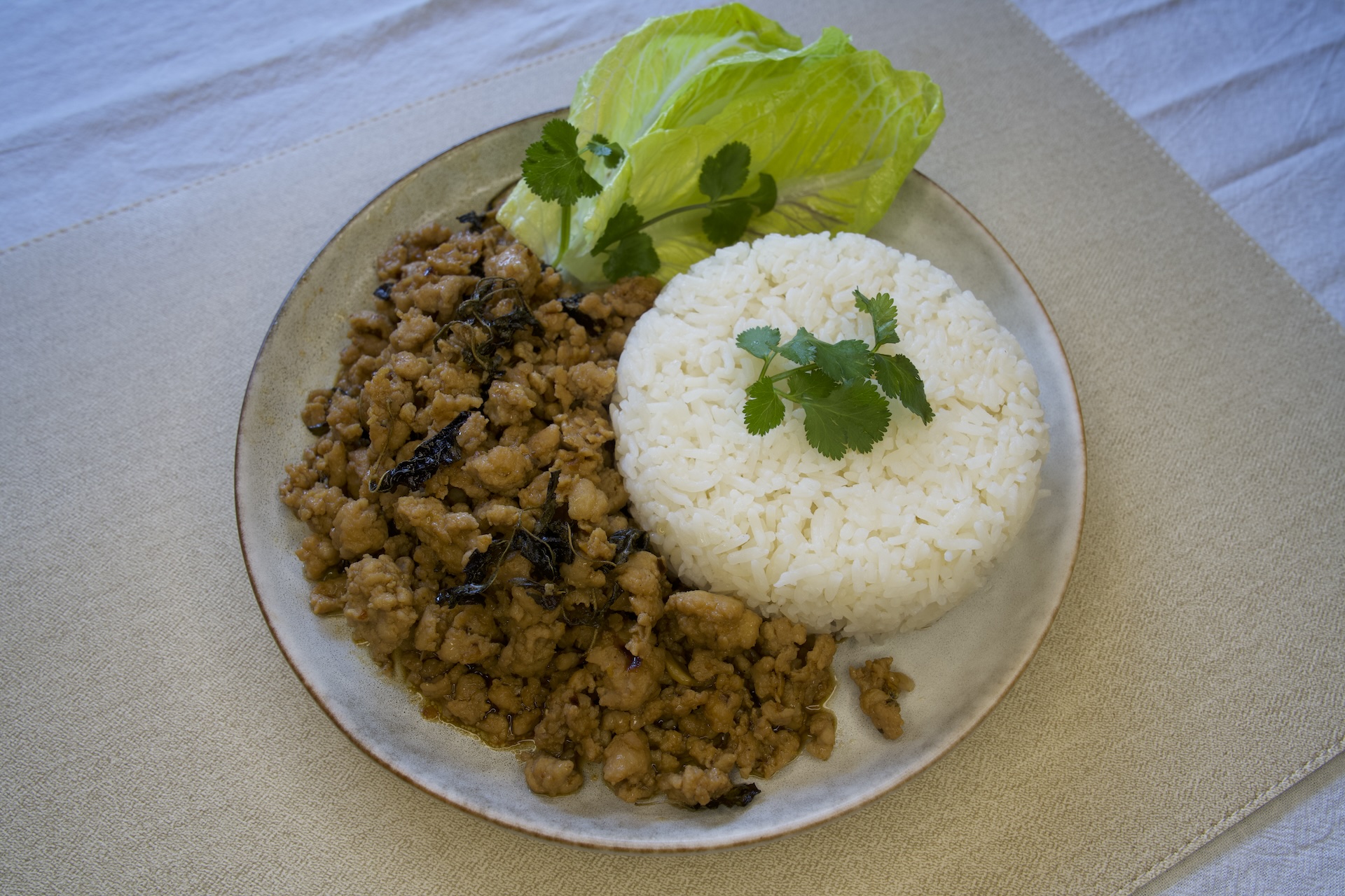 Choice of meat (shrimp/chicken/minced pork/crispy pork) stir fried with basil.